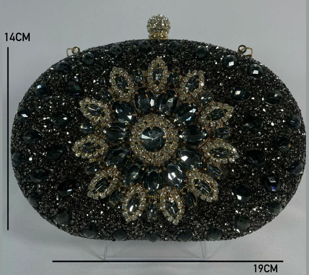 Perfeita para quem ama sofisticação e impacto, essa clutch traz um design oval exuberante, ricamente trabalhado com pedrarias e brilhos em um desenho que lembra uma mandala ou uma joia lapidada. A alça delicada e o fecho com detalhe em strass oferecem um toque de elegância atemporal. Ideal para eventos noturnos, festas e ocasiões onde o glamour é essencial.
